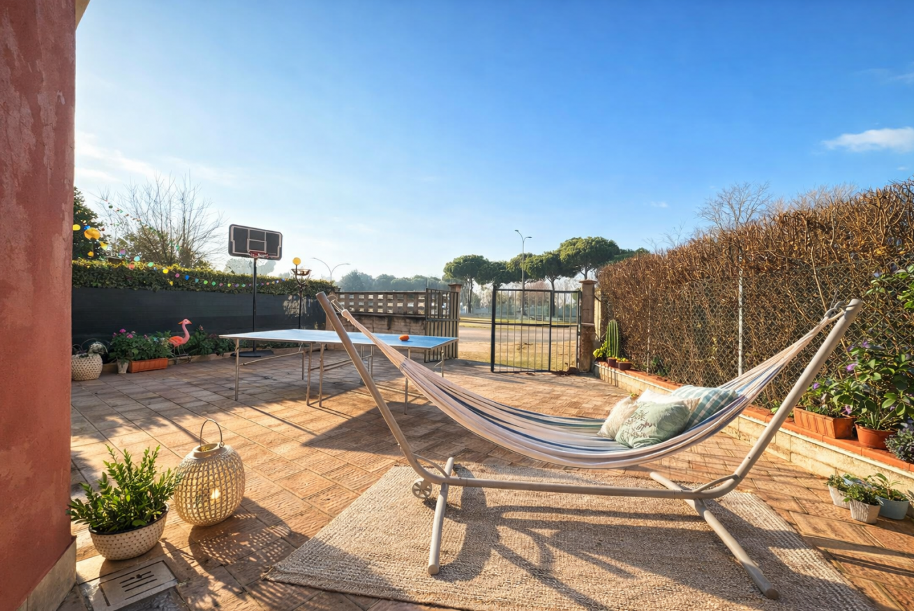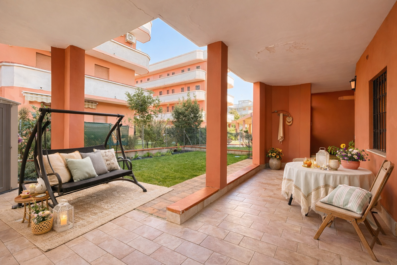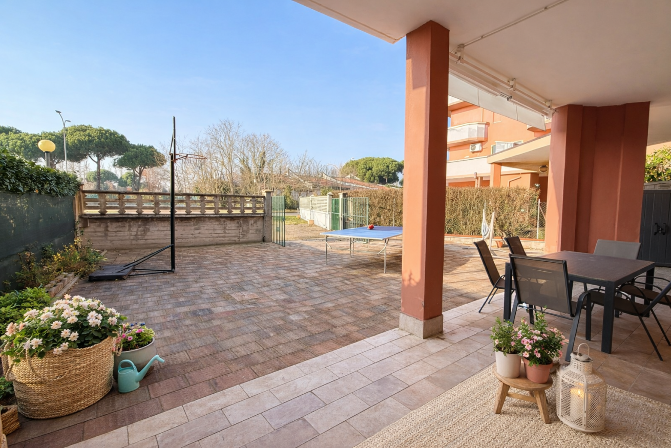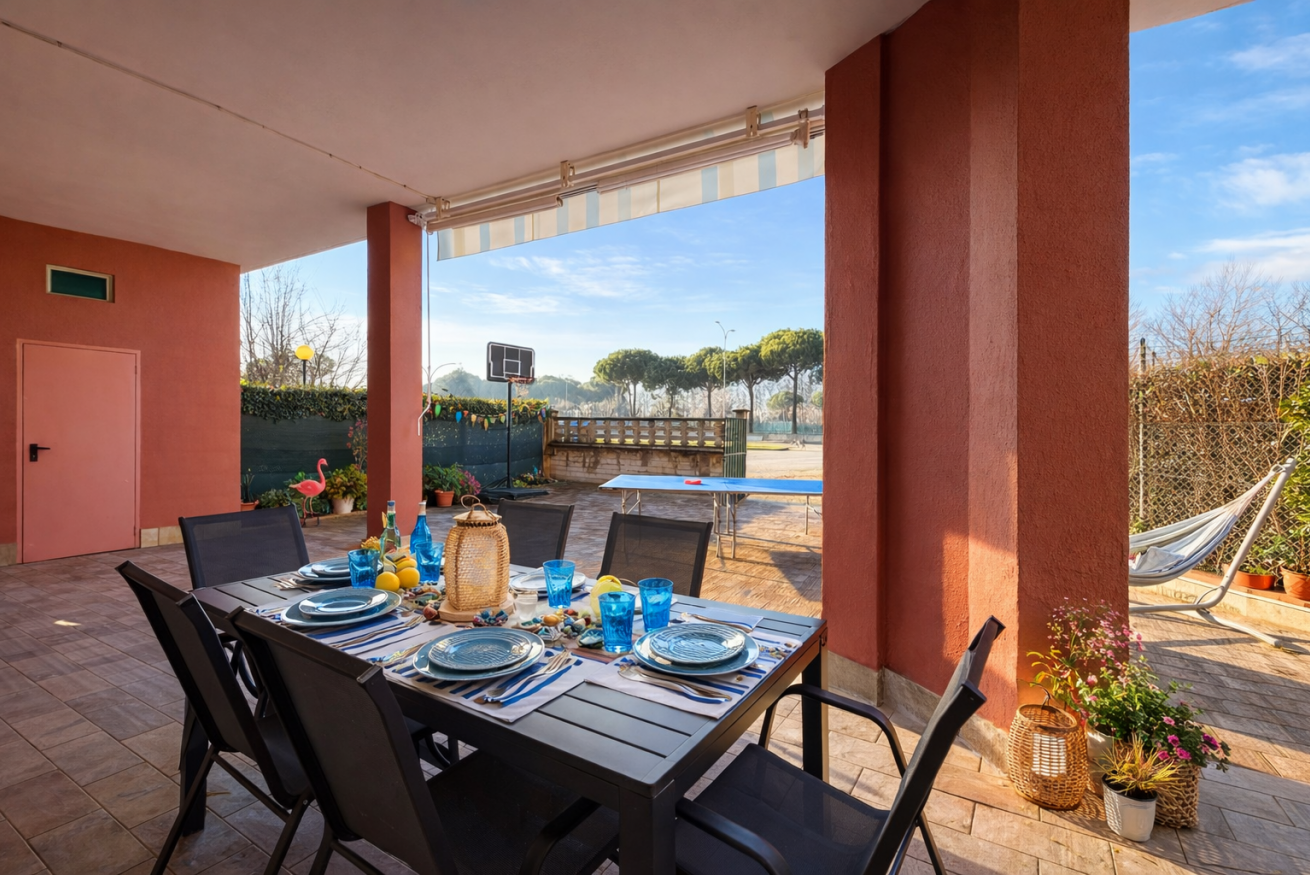 L’alloggio si trova al piano terra ed è dotato di giardino privato e ampio porticato coperto, perfetto per pranzi e cene all’aperto o momenti di relax.